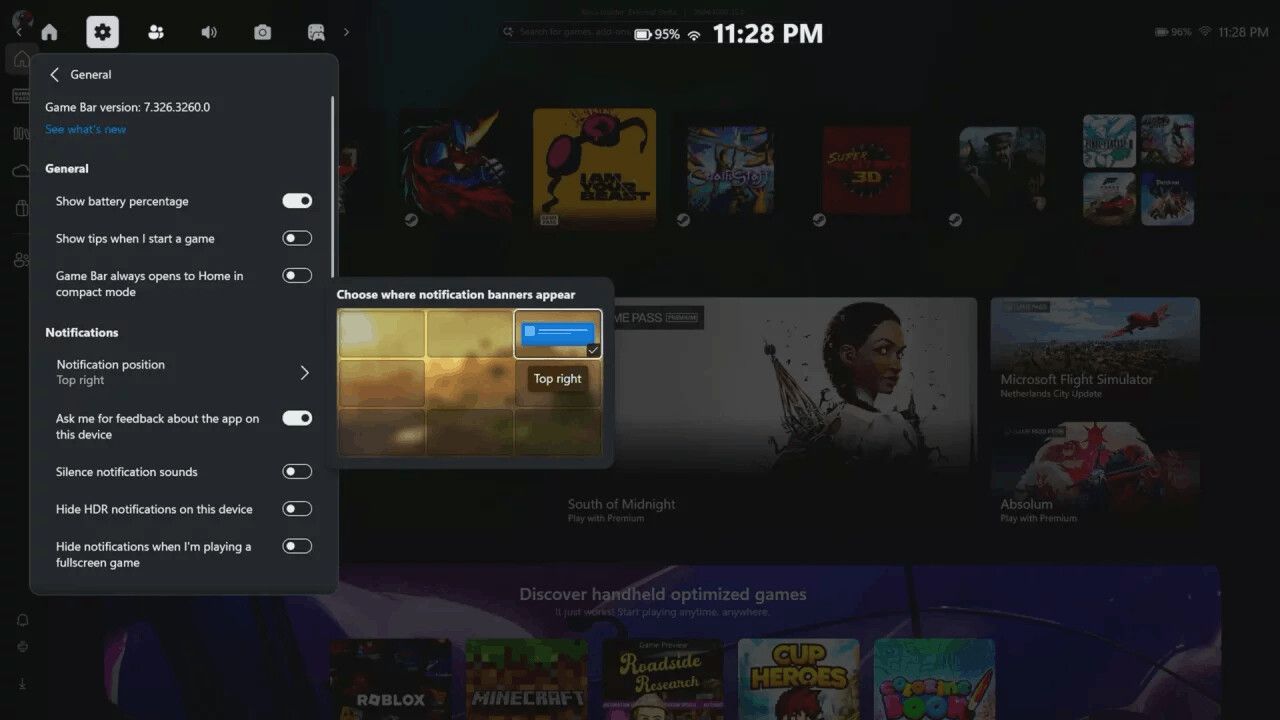 除显示控制外,更新还赋予用户更精细的通知管理权限。玩家可根据个人习惯自定义提醒弹窗位置,避免重要界面元素被遮挡或游戏过程被打扰。这种细节优化体现了微软对掌机用户实际场景的深入理解。